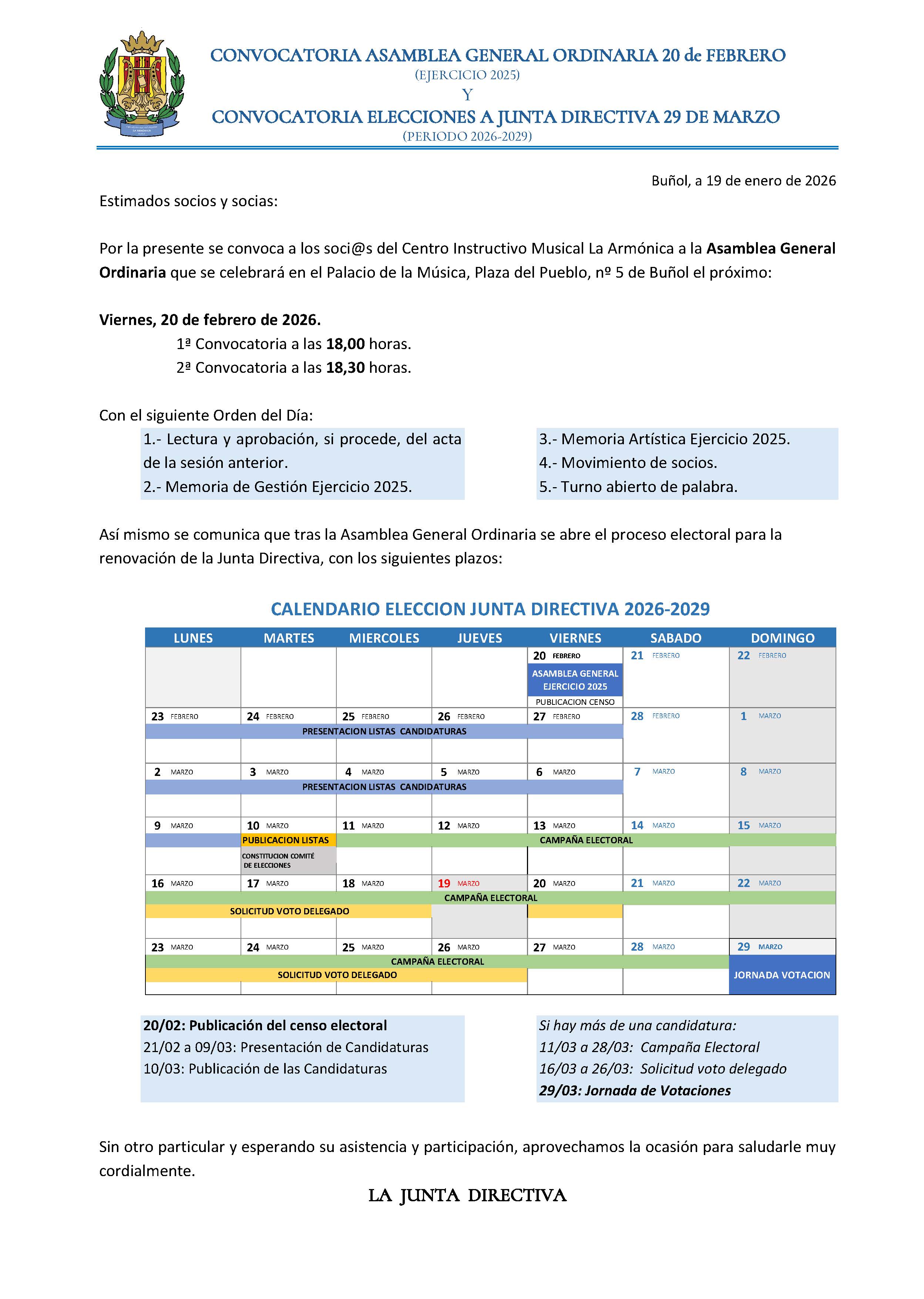 Convocatoria Asamblea General Ordinaria Ejercicio 2025 y Convocatoria Elecciones a Junta Directiva